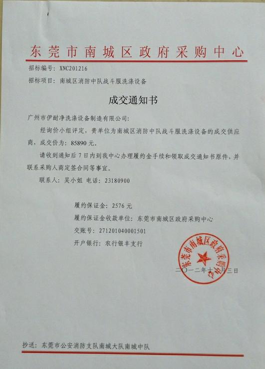 東莞市公安消防支隊南城中隊戰斗服洗滌設備項目中,廣州伊耐凈洗滌設備制造有限公司,技壓群雄,脫穎而出,以85890元價,成功中標。